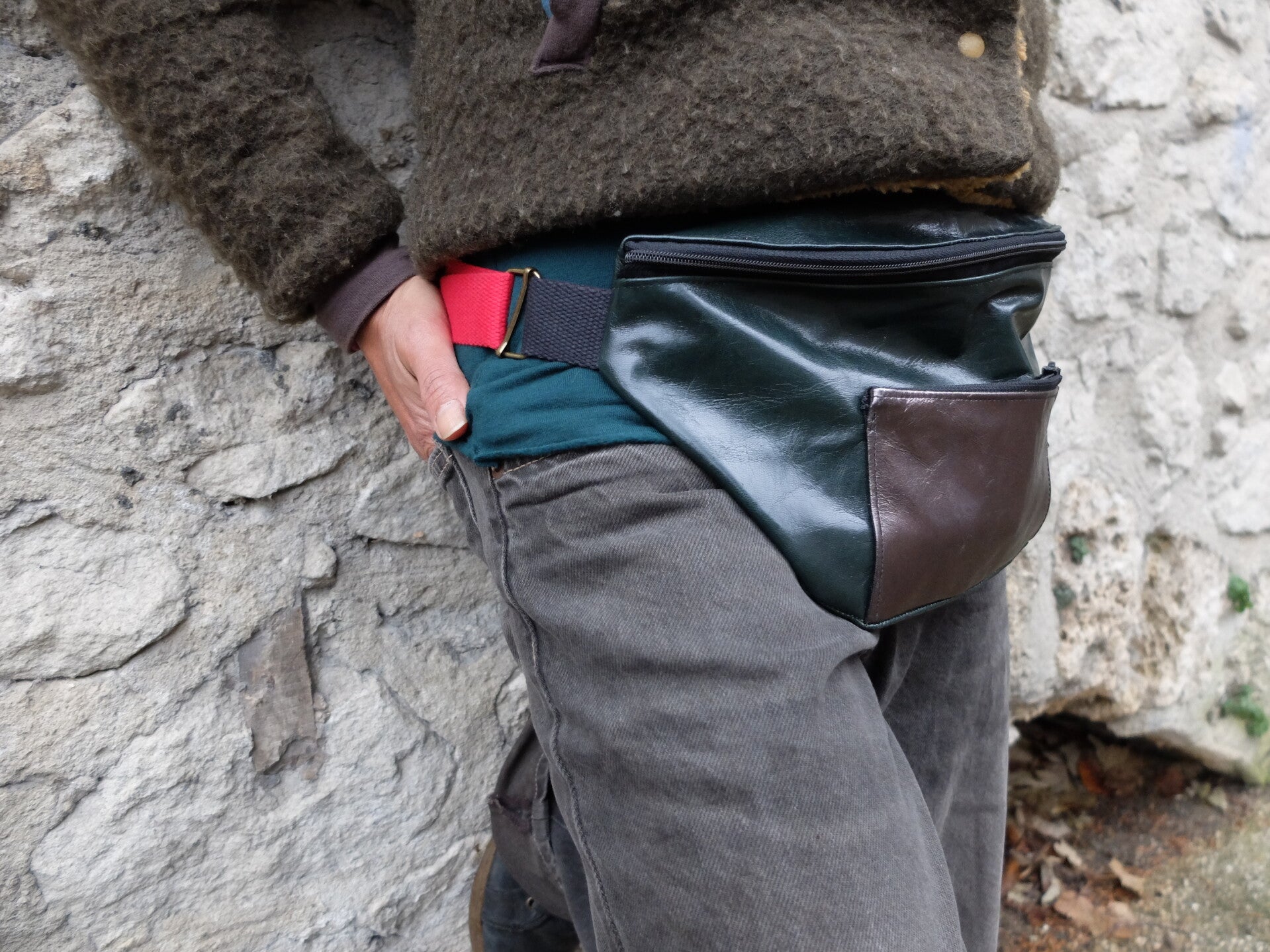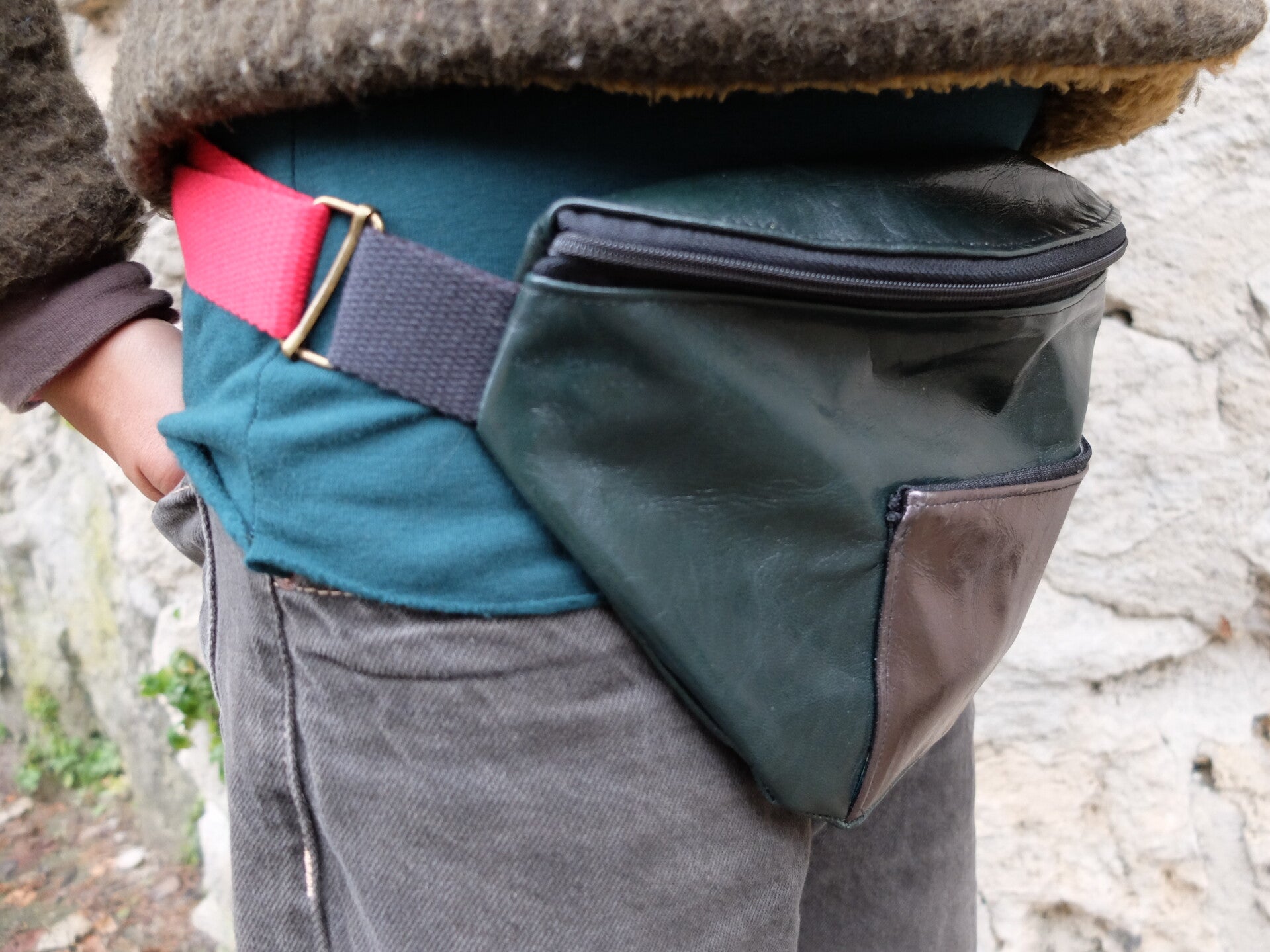 Banane en cuir vert bouteille avec petite pochette à l'avant