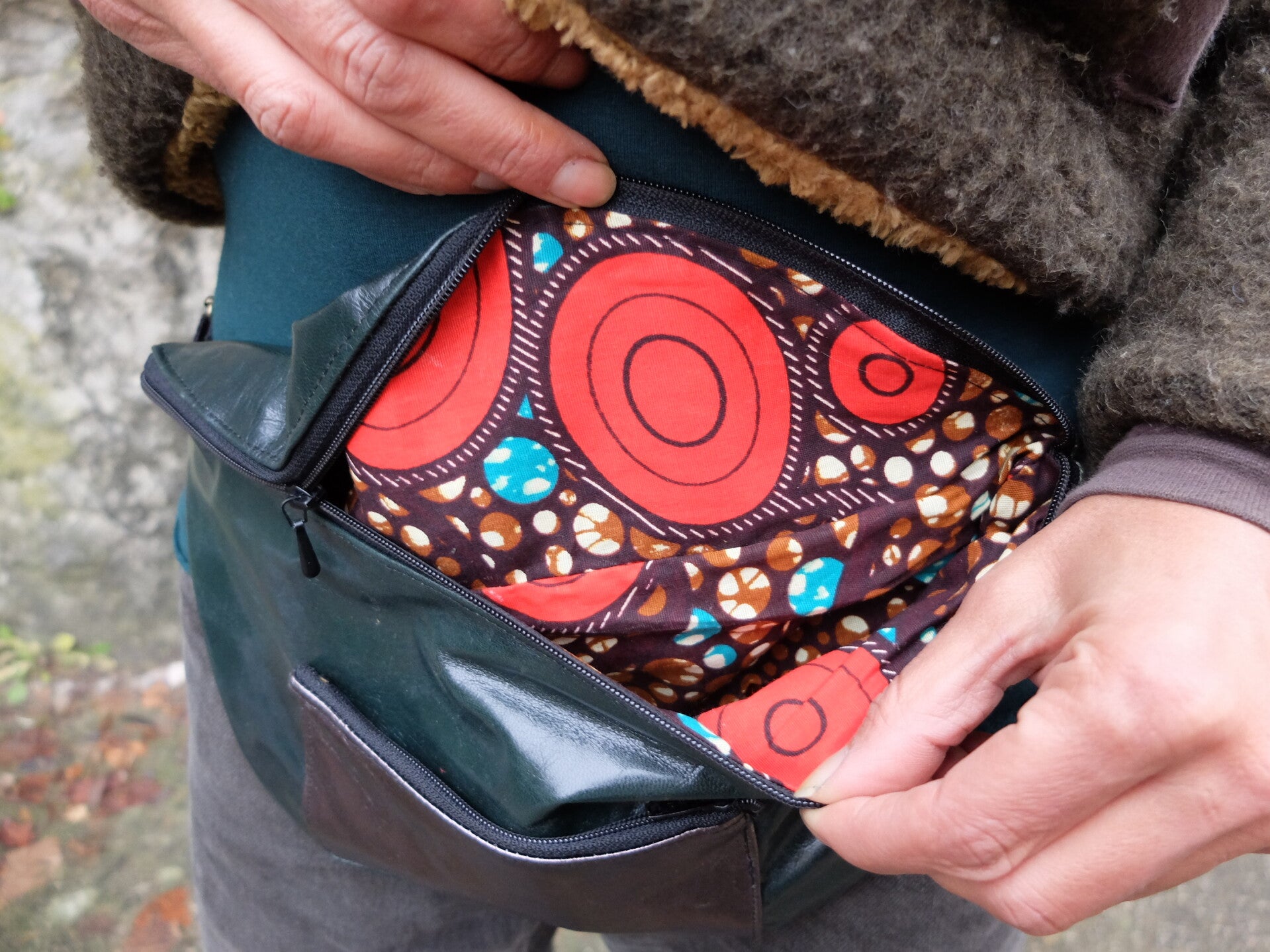 Sacoche en cuir et intérieur wax. Une poche sur l'avant avec fermeture éclaire. Fermeture éclaire e fermeture principale. Taille réglable avec sangle noire et rouge. Peut se porter sur l'épaule, le dos ou à la taille.