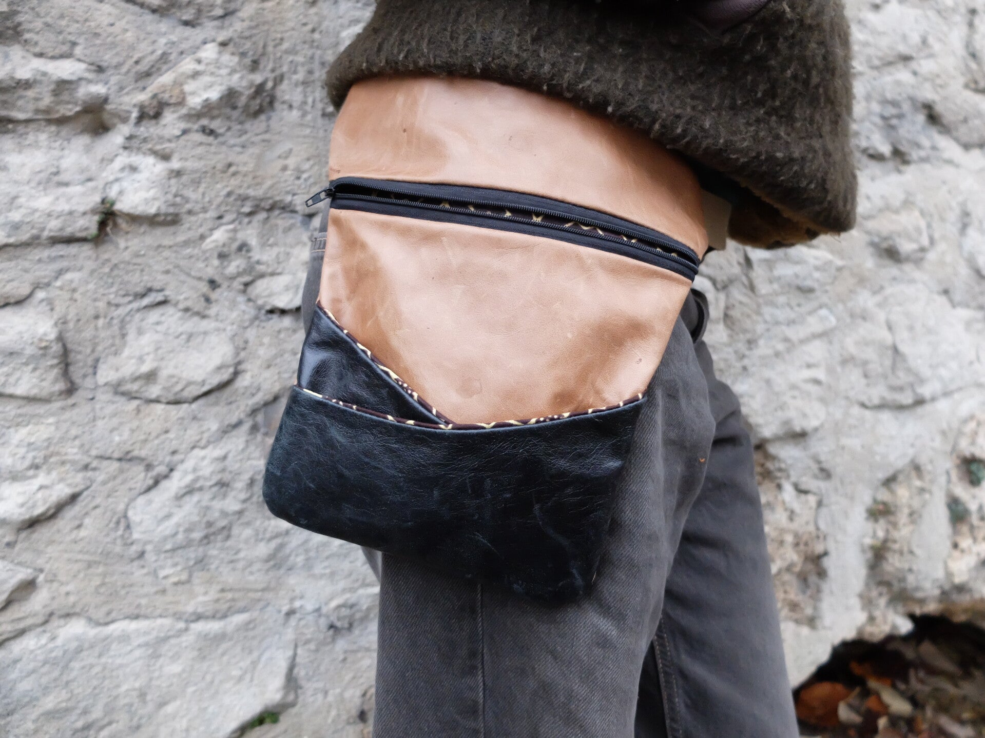 Sacoche en cuir noir et marron clair et intérieur wax. Double poche sur l'avant. Fermeture éclaire en fermeture principale. Taille réglable avec sangle noire. Peut se porter sur l'épaule, le dos ou à la taille.