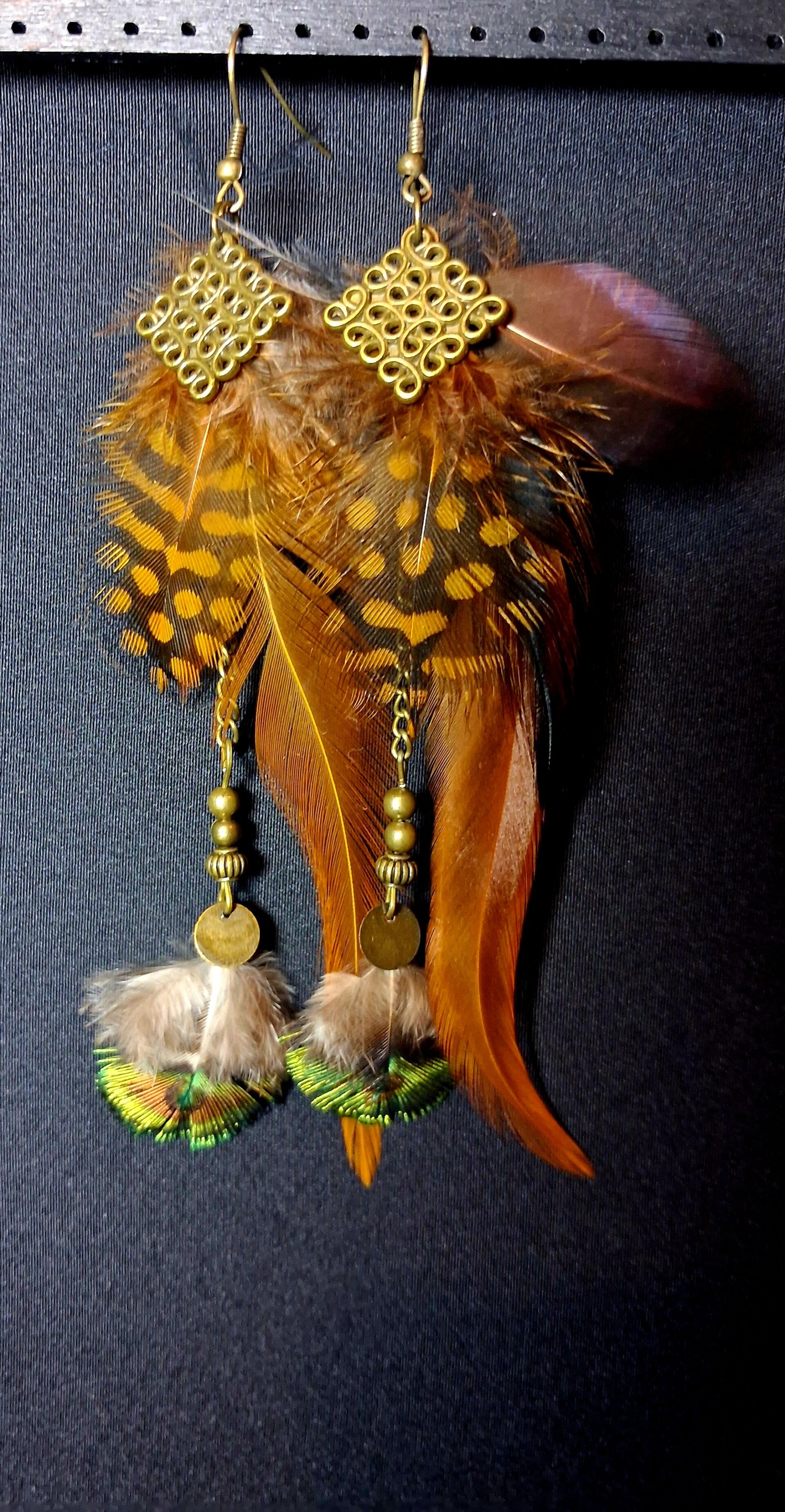 Boucles d’oreilles en plumes et pampilles couleur bronze.