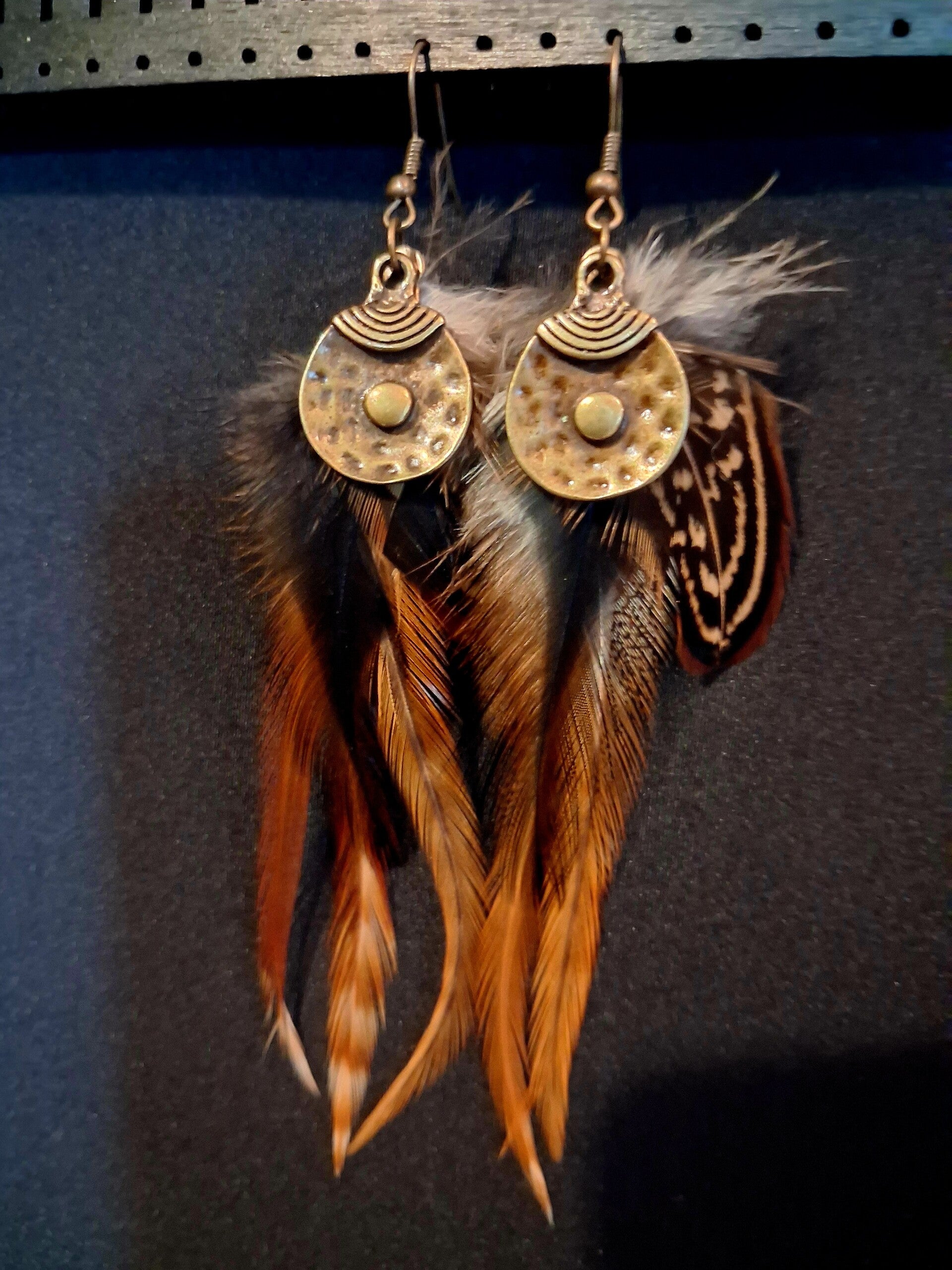 Boucles d’oreilles en plumes et pampilles couleur bronze.