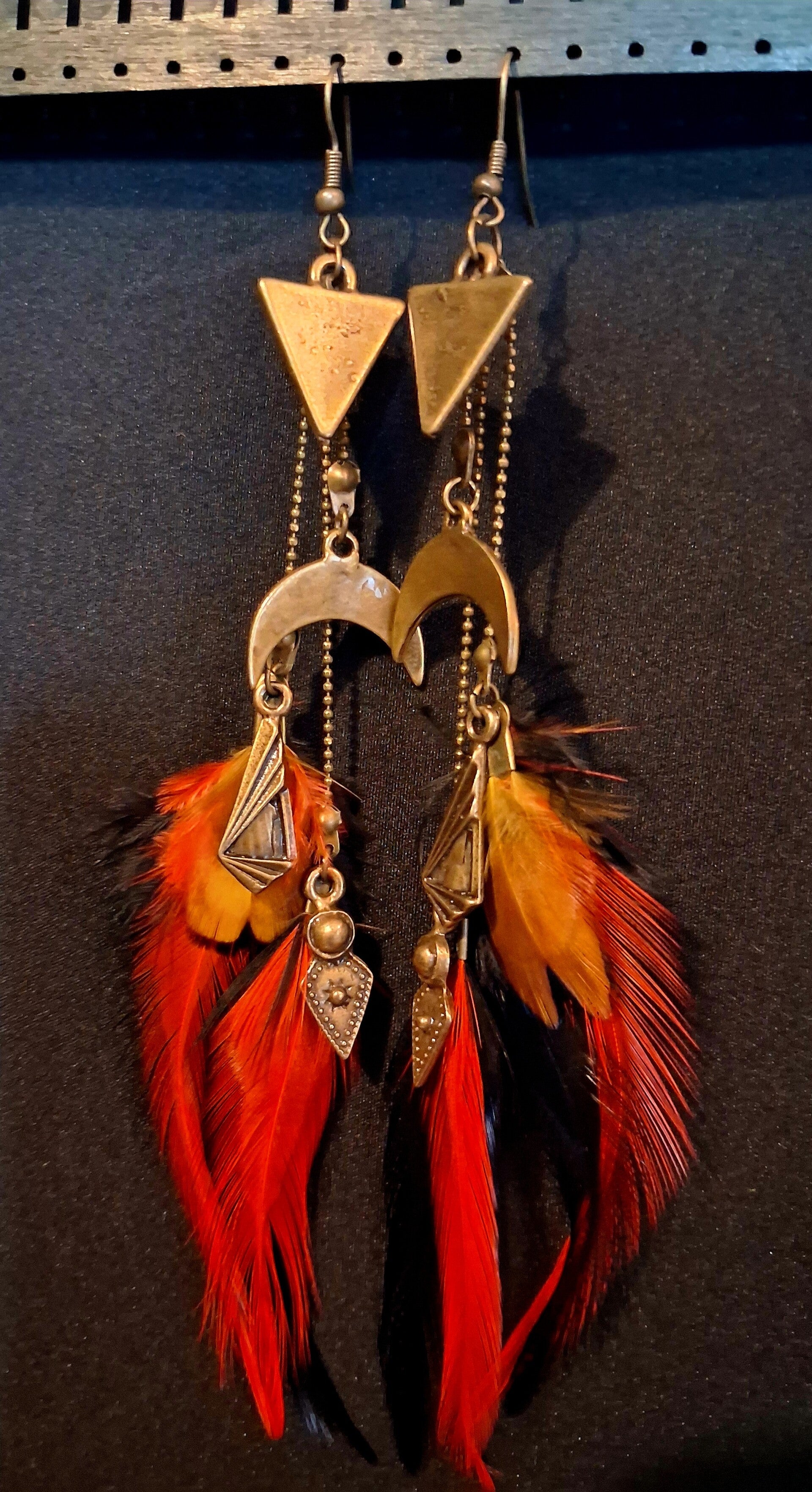 Boucles d’oreilles en plumes et pampilles couleur bronze.