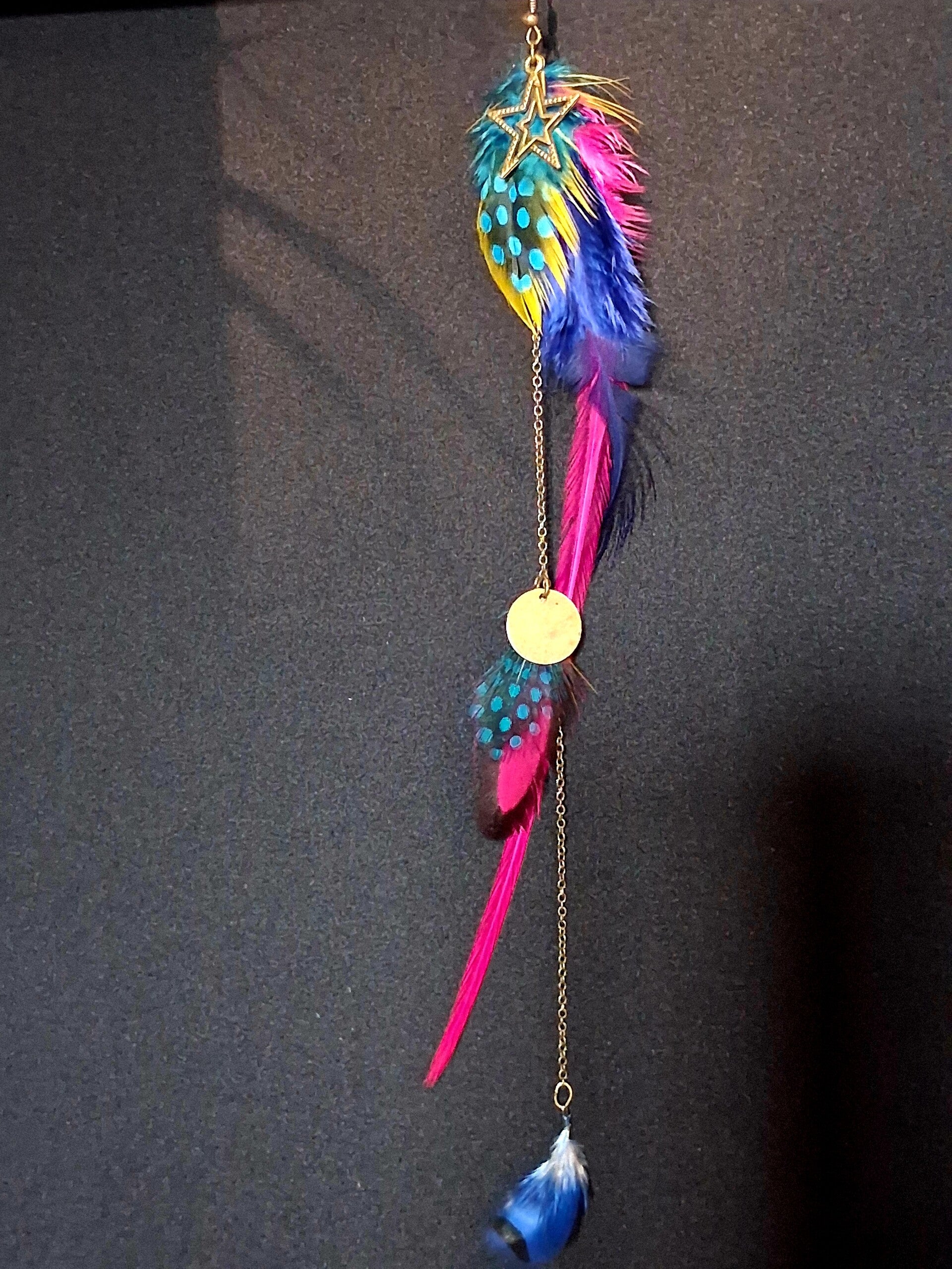 Boucles d’oreilles en plumes et pampilles couleur bronze.